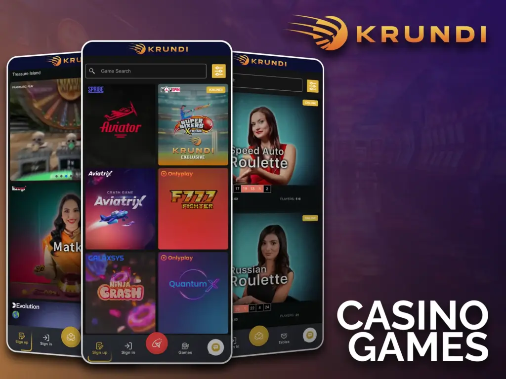 The Krundi app offers not only slots, but also various types of casino games. This variety of gaming opportunities will allow players to maximize their leisure time and improve their gaming experience. The Krundi app will include such games as: